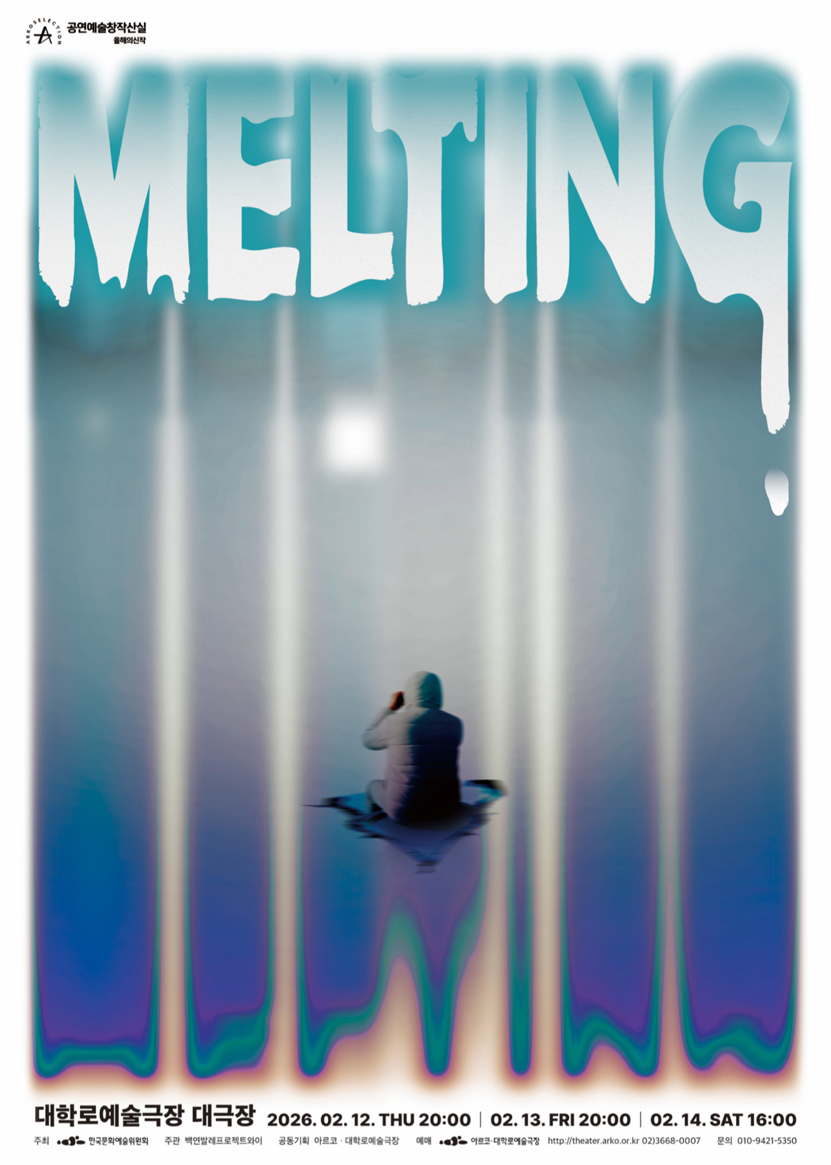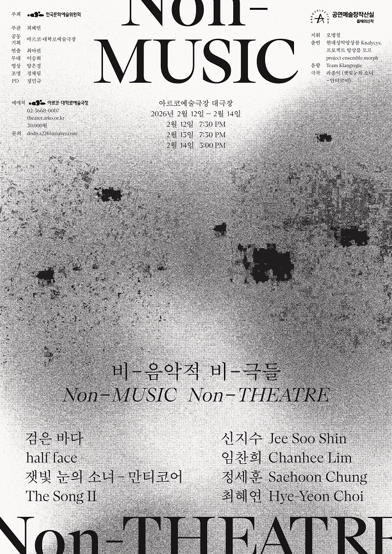ARKO TODAY 2026.02.13 금요일 02-3668-0007 오시는 길 → 프로젝트집단 세사람 <멸종위기종> - 2025 창작산실 올해의신작 연극대학로예술극장 소극장화,목,금요일 19:30 / 수,토요일 15:00, 19:30 / 일요일 15:00 언니들을 찾아서아르코예술극장 소극장화~금요일 20:00 / 토~일요일 15:00백연발레프로젝트와이 <MELTING> - 2025 창작산실 올해의신작 무용대학로예술극장 대극장목~금요일 20:00 / 토요일 16:00최혜연 <비-음악적 비-극들> - 2025 창작산실 올해의신작 음악아르코예술극장 대극장목~금요일 19:30 / 토요일 15:00