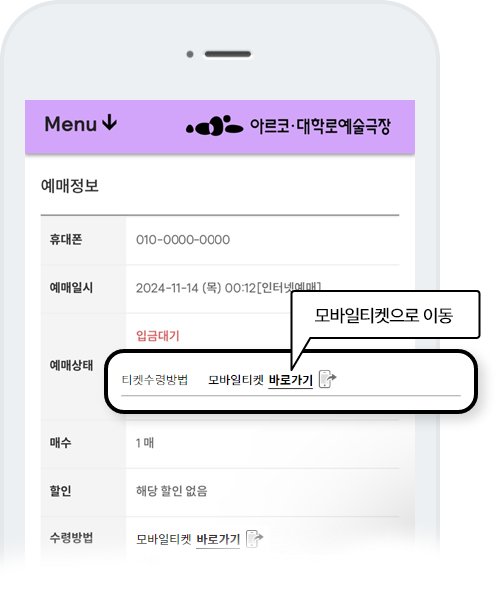 모바일티켓 [바로가기]를 클릭하면, 확인이 가능합니다!