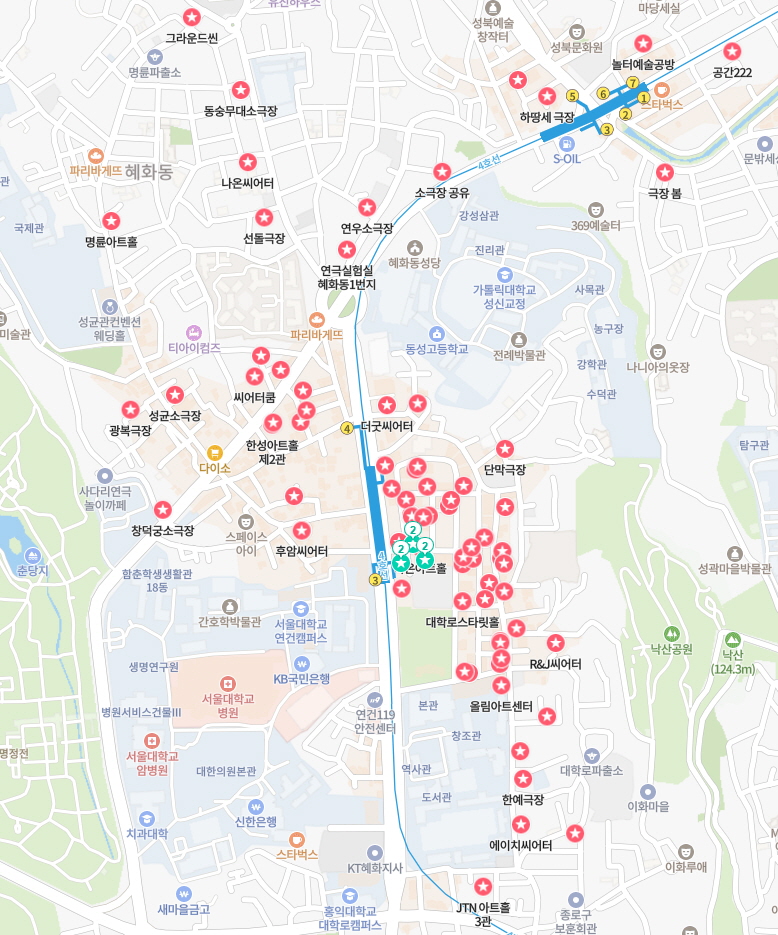 함께 가는 극장 위치 함께 가는 극장 리스트 (총 85개 극장, 가나다 순) JS아트홀 JTN 아트홀 3관 R&J씨어터 SH아트홀 공간 아울 공간222 광복극장 그라운드 씬 극장동국 극장봄 나온씨어터 나인진홀1관 나인진홀2관 놀터예술공방 단막극장 달밤엔씨어터 댕로홀 더굿씨어터 동숭무대소극장 드림시어터 라온씨어터 라온아트홀 루미나아트홀 마루아트홀 명륜아트홀 바탕골소극장 봄날아트홀 1관 봄날아트홀 2관 북극곰소극장 브릭스씨어터 서연아트홀 선돌극장 성균소극장 세우아트센터 1관 세우아트센터 2관 소극장 공유 소극장혜화당 스카이씨어터 2관 스타릿홀 스타스테이지 스튜디오블루 시윤아트홀 씨어터조이 씨어터쿰 아라아트홀 아트하우스 업스테이지 에이치씨어터 여행자극장 연극실험실혜화동1번지 연우소극장 열린극장 올래홀 올림아트센터 올웨이즈씨어터 우리소극장 이음아트홀 자유극장 정극장 제나아트홀 제이원 씨어터 지인시어터 지즐소극장 창덕궁소극장 초록씨어터 컬쳐씨어터 코델아트홀 콘텐츠박스 틴틴홀 파랑새극장 파랑씨어터 플랫폼74 플레이더 씨어터 피카소소극장 하땅세극장 하마씨어터 한성아트홀 1관 한성아트홀 2관 한예극장1관 한예극장2관 해바라기소극장 해피시어터 홍해성소극장 후암스테이지 후암시어터